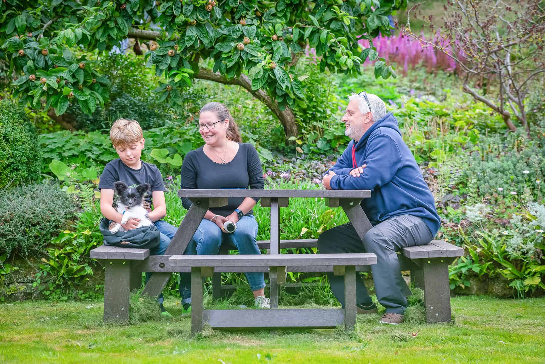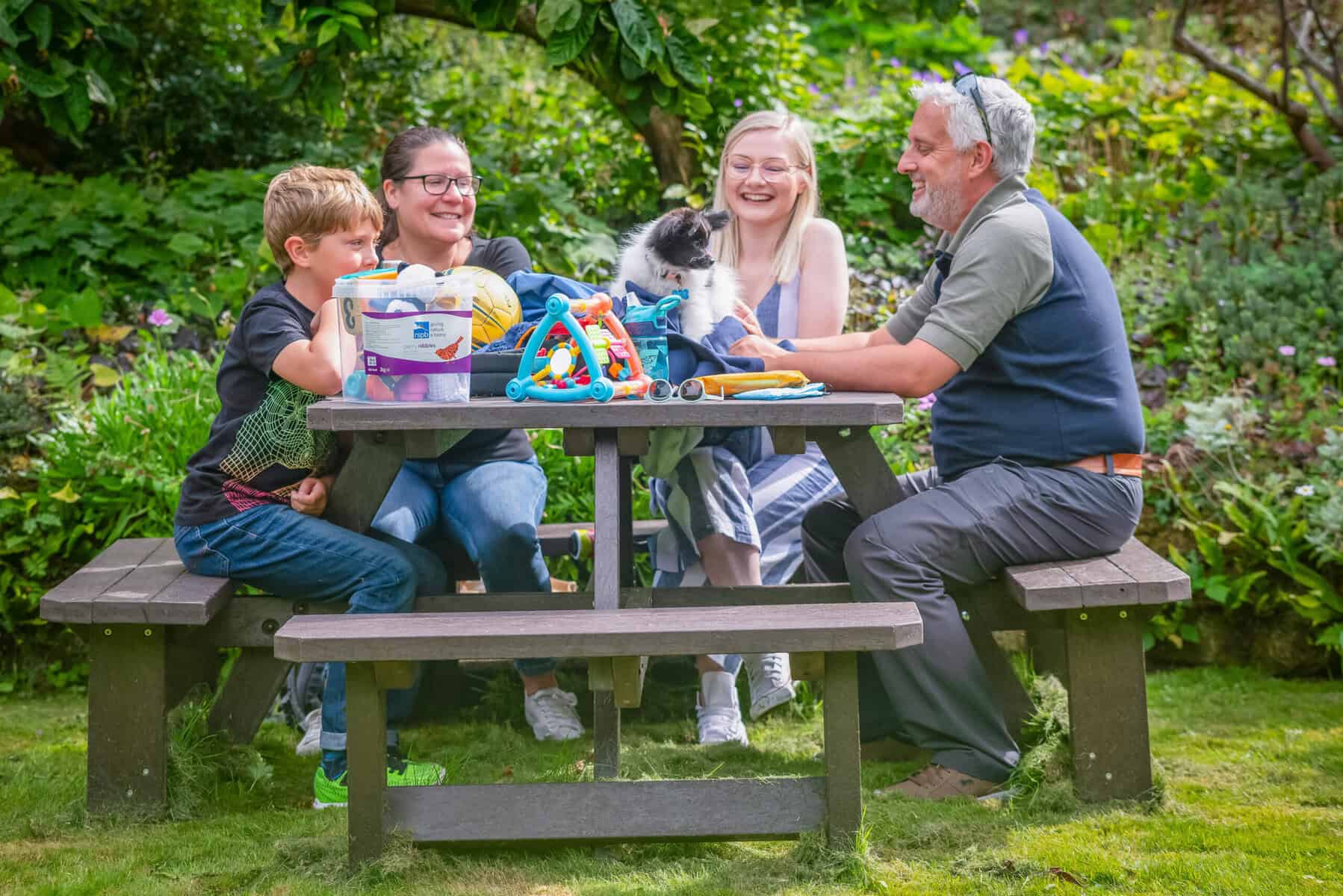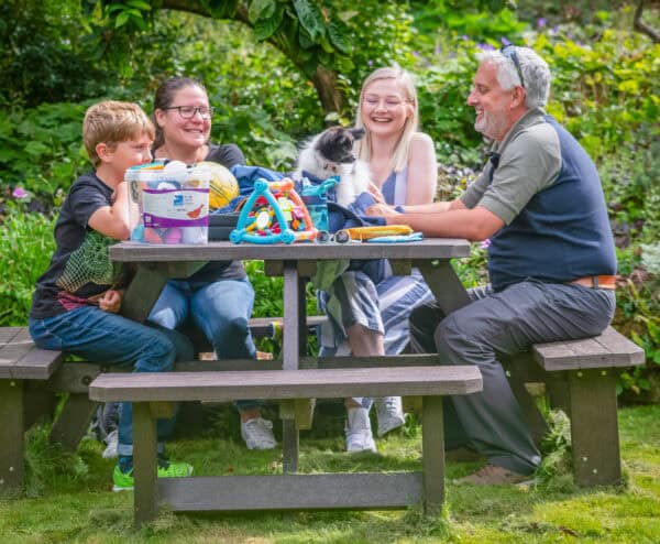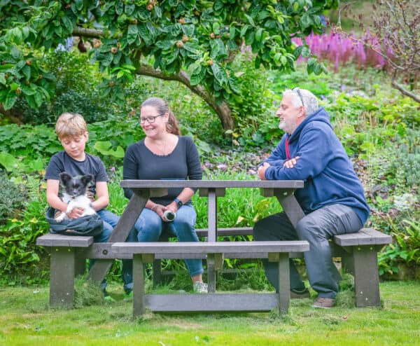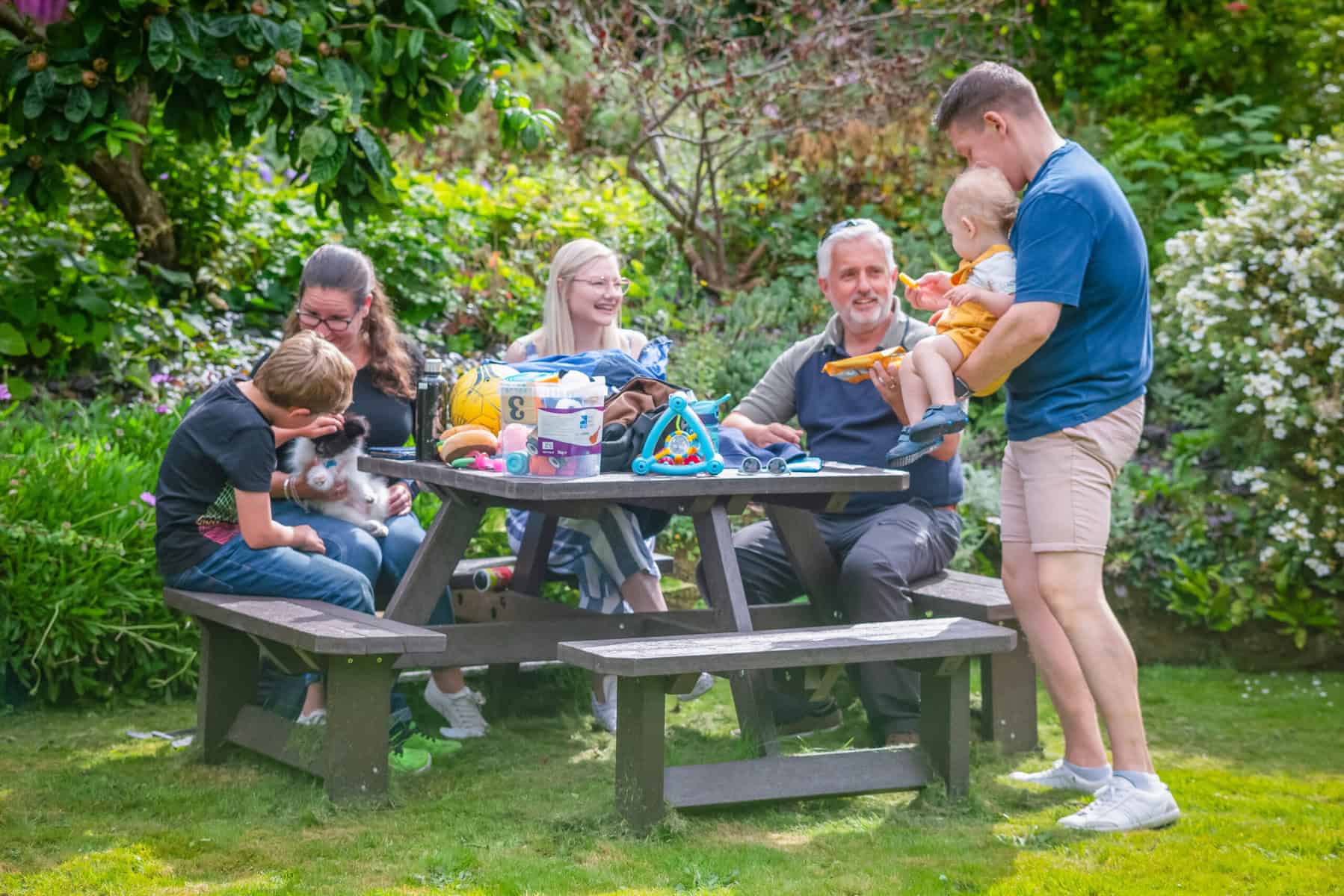Finally got the table together when my son was able to come and join his brother (2 strong lads) to do the assembly a week ago. You said it was heavy but I hadn’t thought it would be so heavy, certainly I couldn’t have managed it. There is no likelihood of the tables ever blowing away. I am attaching photos of the picnic table and dining set in the garden and one of the inaugural celebration party in which everyone, my sons, grandchildren, friend and I are showing our appreciation of a job well done. Sadly I seem to be the only one not smiling, which is a pity as I am very pleased indeed. Thank you all very much for a job well done.