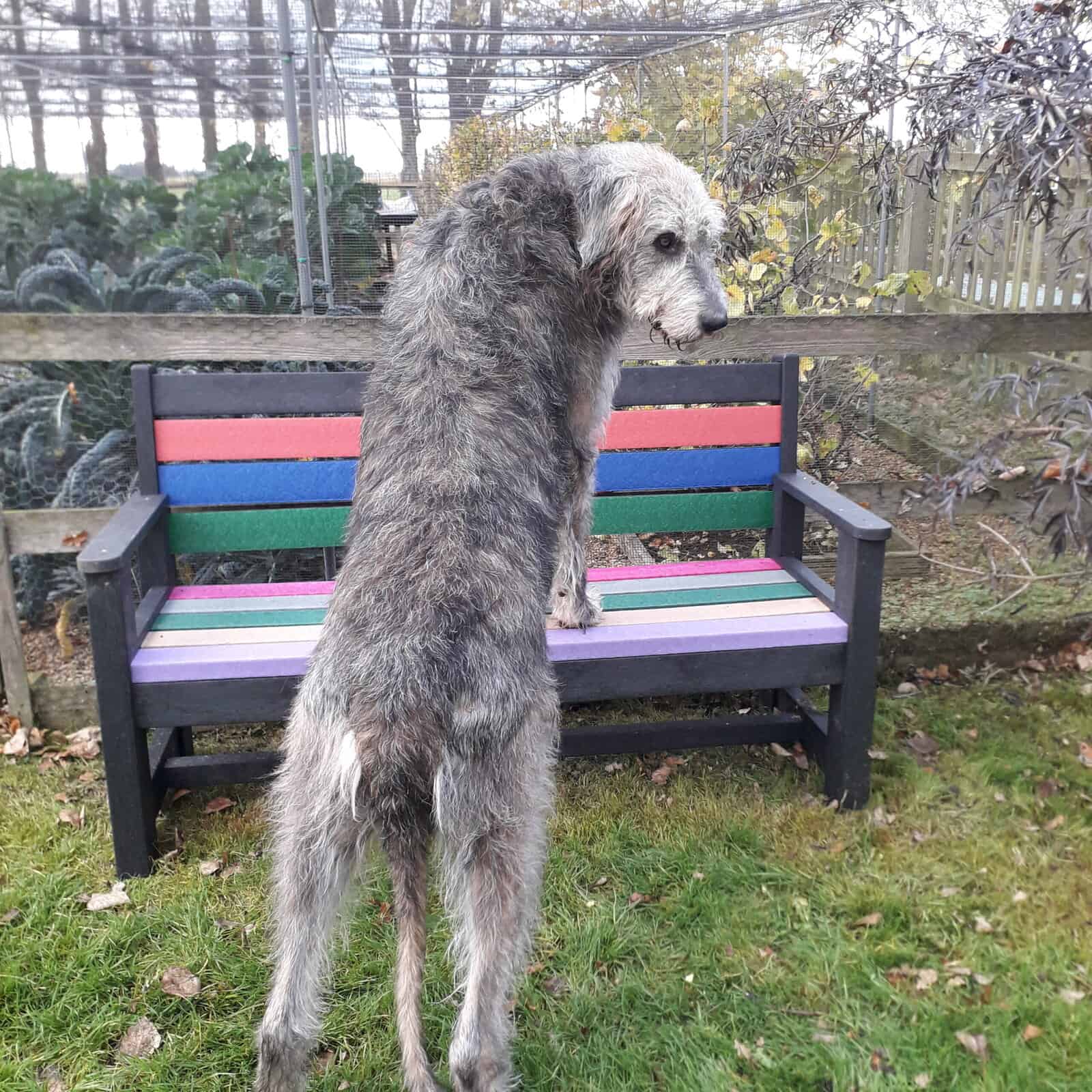 We are absolutely thrilled with our bench which arrived last month and thought you might like to see a pic of it insitu. So here’s a pic of one of our Wolfhounds giving it his approval. (not a small bench –just a very big dog)